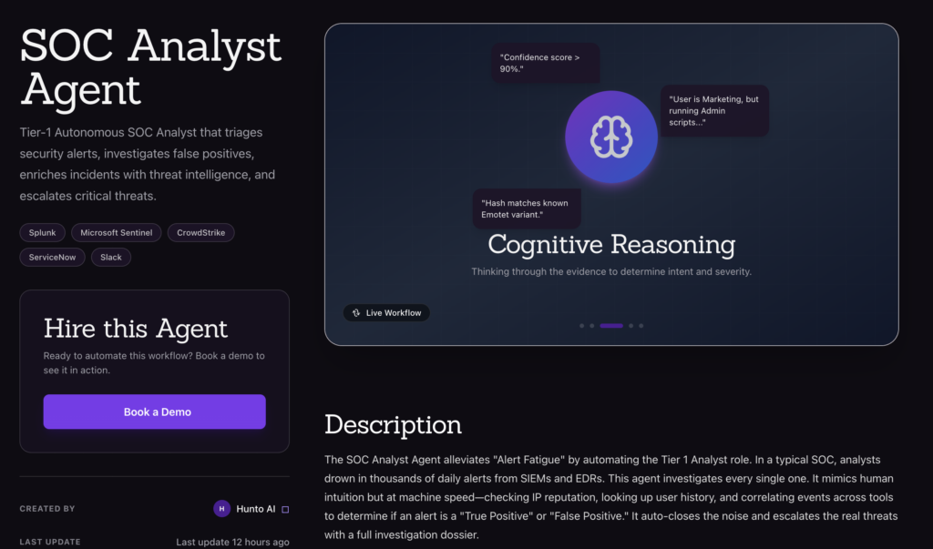 Designed for SIEM/EDR-powered SOCs, it uses LLMs optimised for Cybersecurity plus deterministic logic to mimic human reasoning. Hunto bills this agent as a “Tier‑1 Autonomous SOC Analyst that triages alerts, investigates false positives, enriches incidents with threat intelligence, and escalates critical threats”.