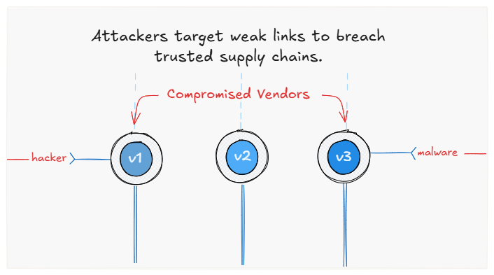 - High-profile supply chain attacks like SolarWinds (2020): Hackers inserted a backdoor into a software update from SolarWinds, which infected thousands of organizations, including government agencies and big companies.